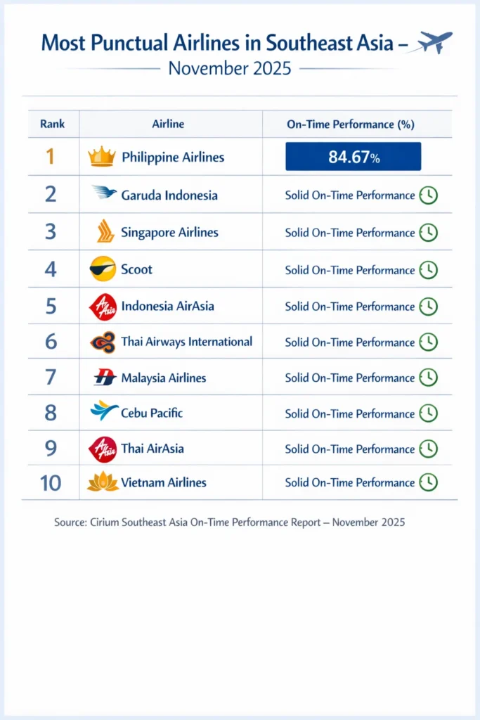 “According to Cirium’s Southeast Asia monthly on‑time performance report for November 2025, Philippine Airlines emerged as the most punctual airline in the region, with an impressive 84.67% of flights operating on time. This means that more than four out of five flights departed or arrived within 15 minutes of schedule.”