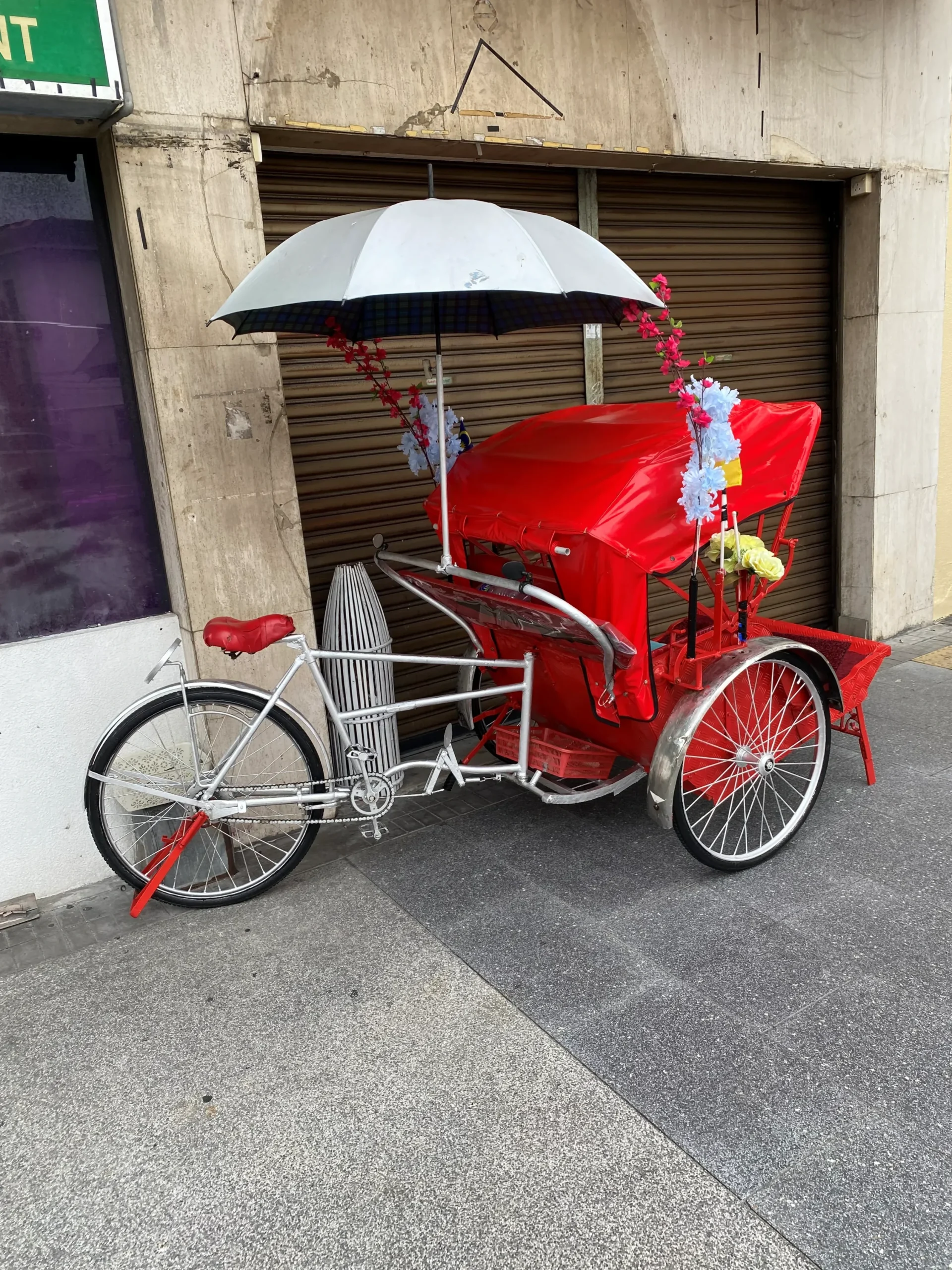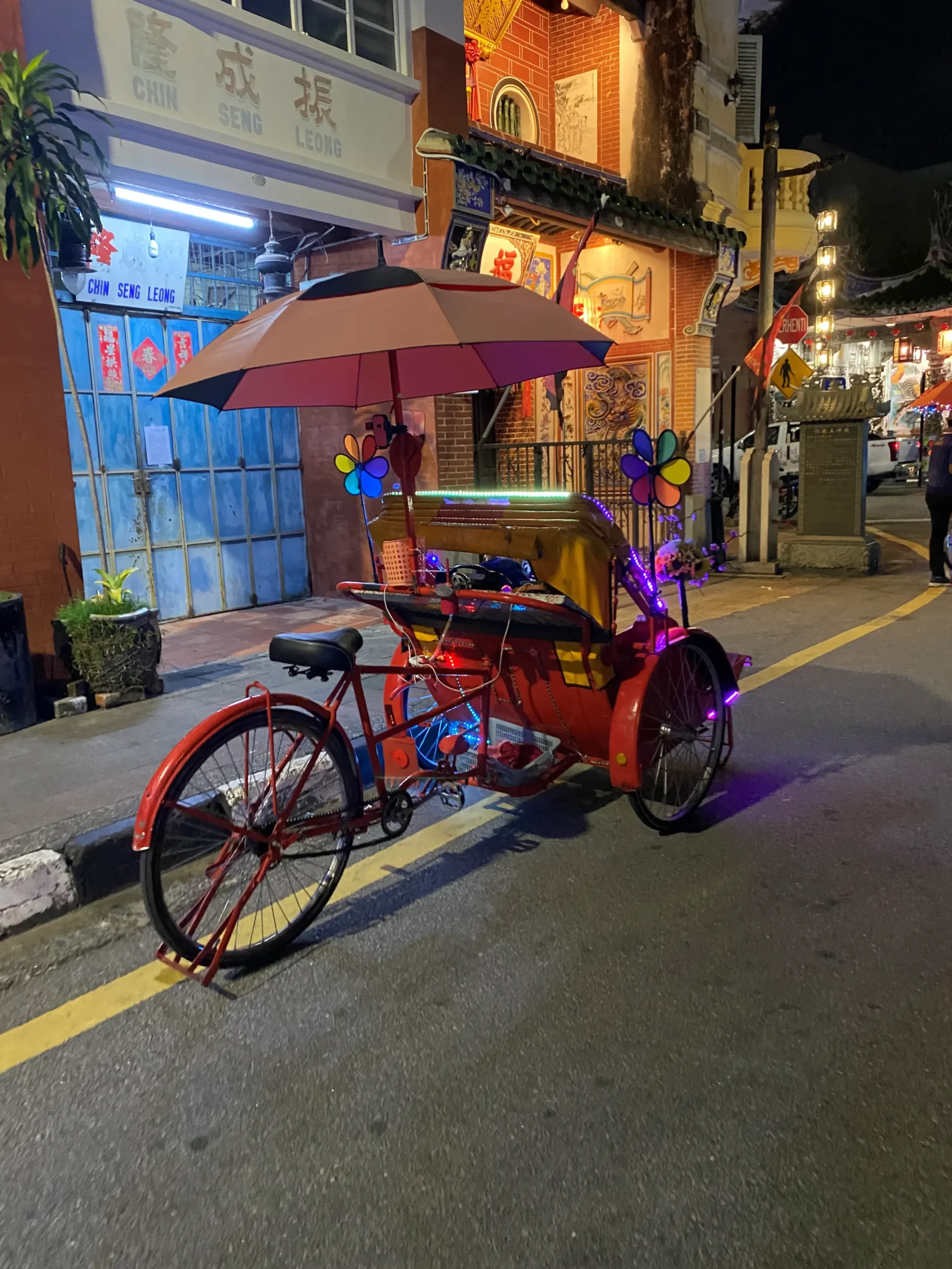 You can also take a ride on a trishaw (a three‑wheeled bicycle taxi) along Armenian Street, where a man often sings live music on the corner, and many of the main souvenir shops are located.