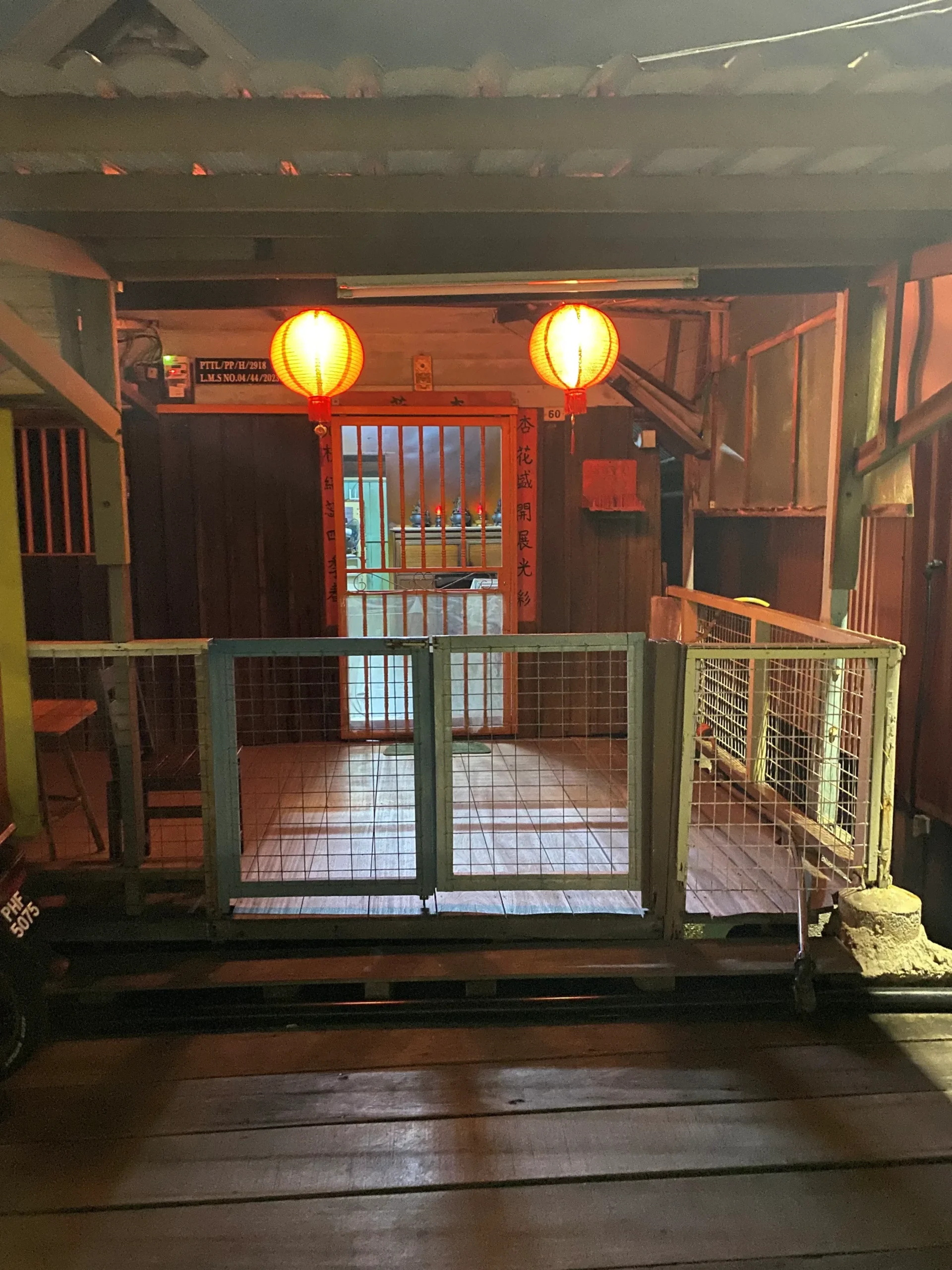 Wooden lantern-lit doorway on Penang’s historic Clan Jetties.